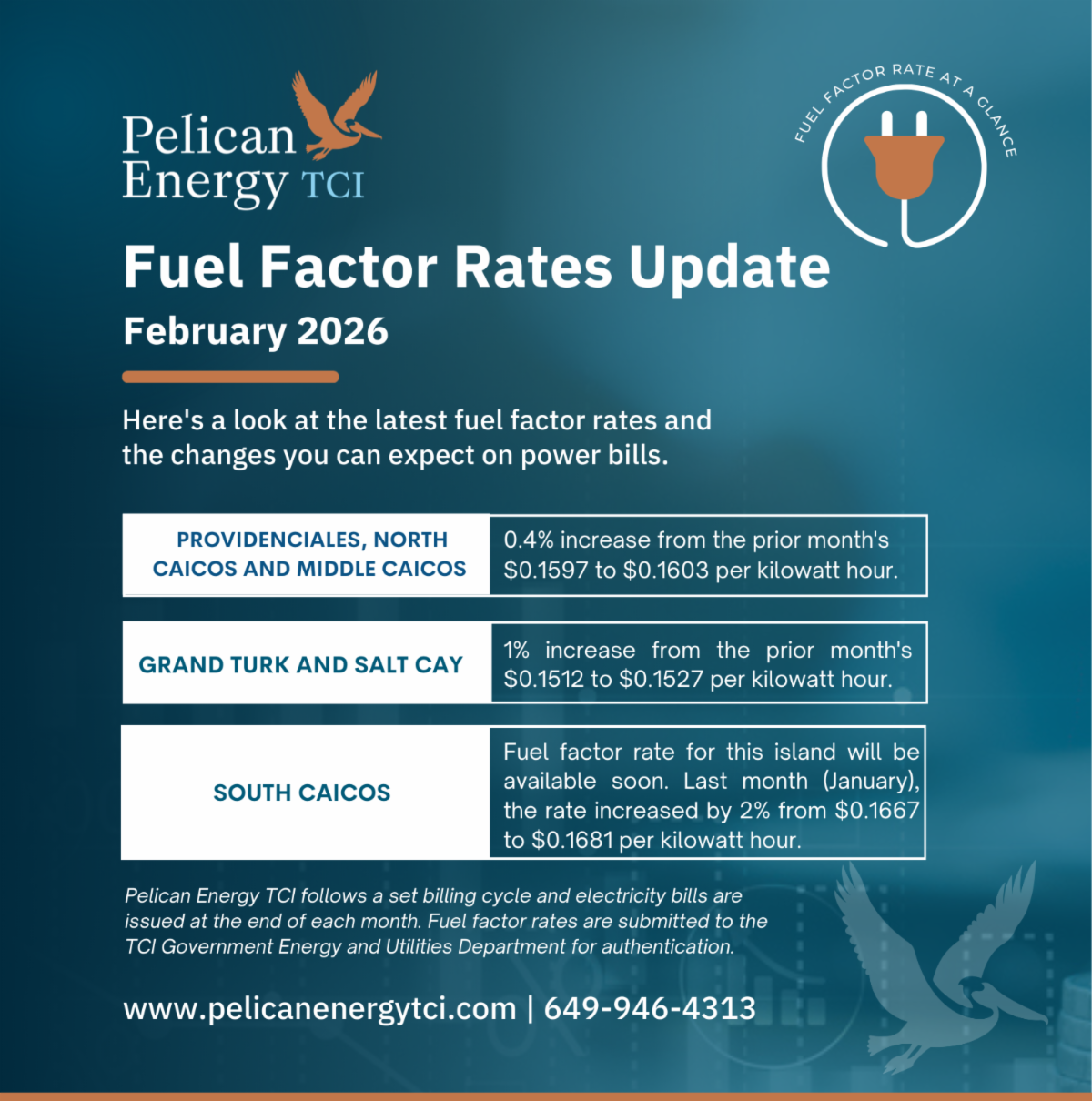 - South Caicos: The fuel factor for this island will be available soon. Last month (January), the rate increased by 2% to $0.1681 per kWh.